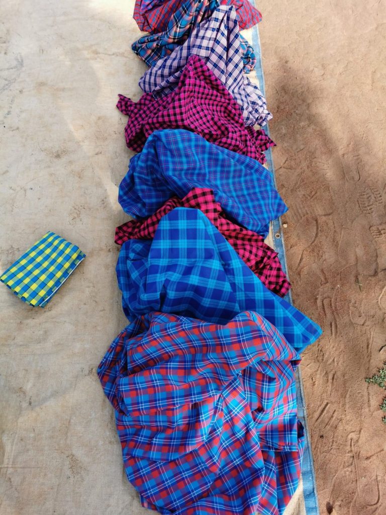 The blankets on sale are called Shuka, and are the traditional wear for Barabaig women and men around here. Most sellers place each cloth in a sort of a pile, with the tip pointing upward.